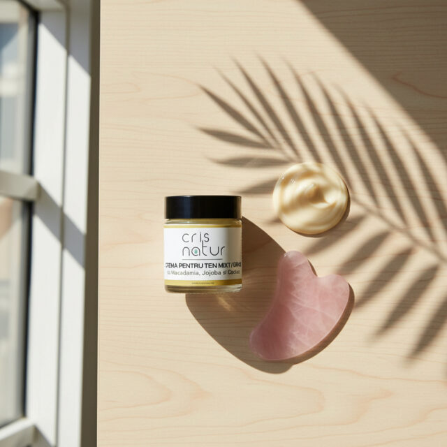 Ten gras/mixt: Optează pentru texturi lejere, cu uleiuri non-comedogenice (ex. jojoba) și ingrediente echilibrante.
