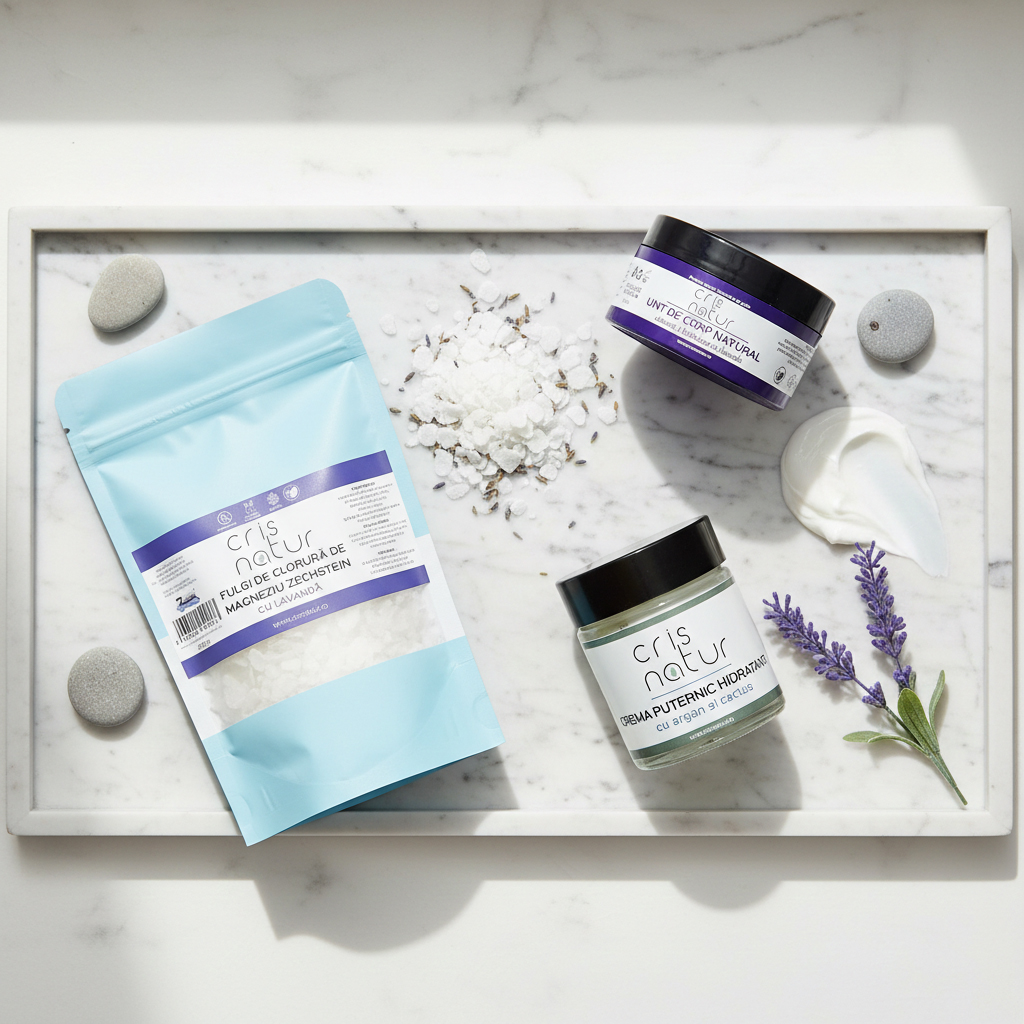 Fulgii de Magneziu Zechstein (Pungă Reîncărcare) – Remineralizare: Sursa pură de magneziu transdermal care elimină tensiunea musculară și stresul acumulat peste zi, facilitând un somn regenerator.