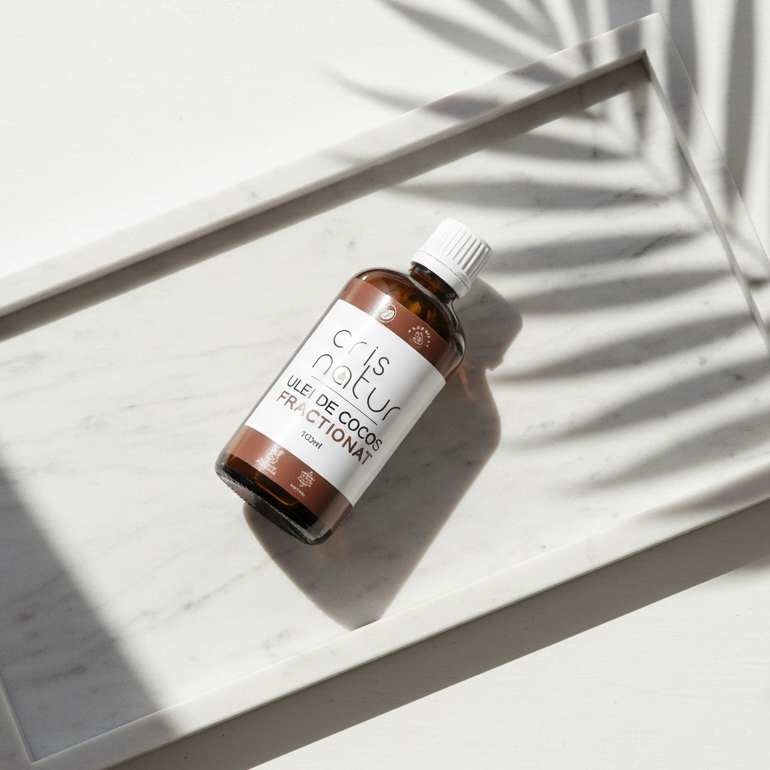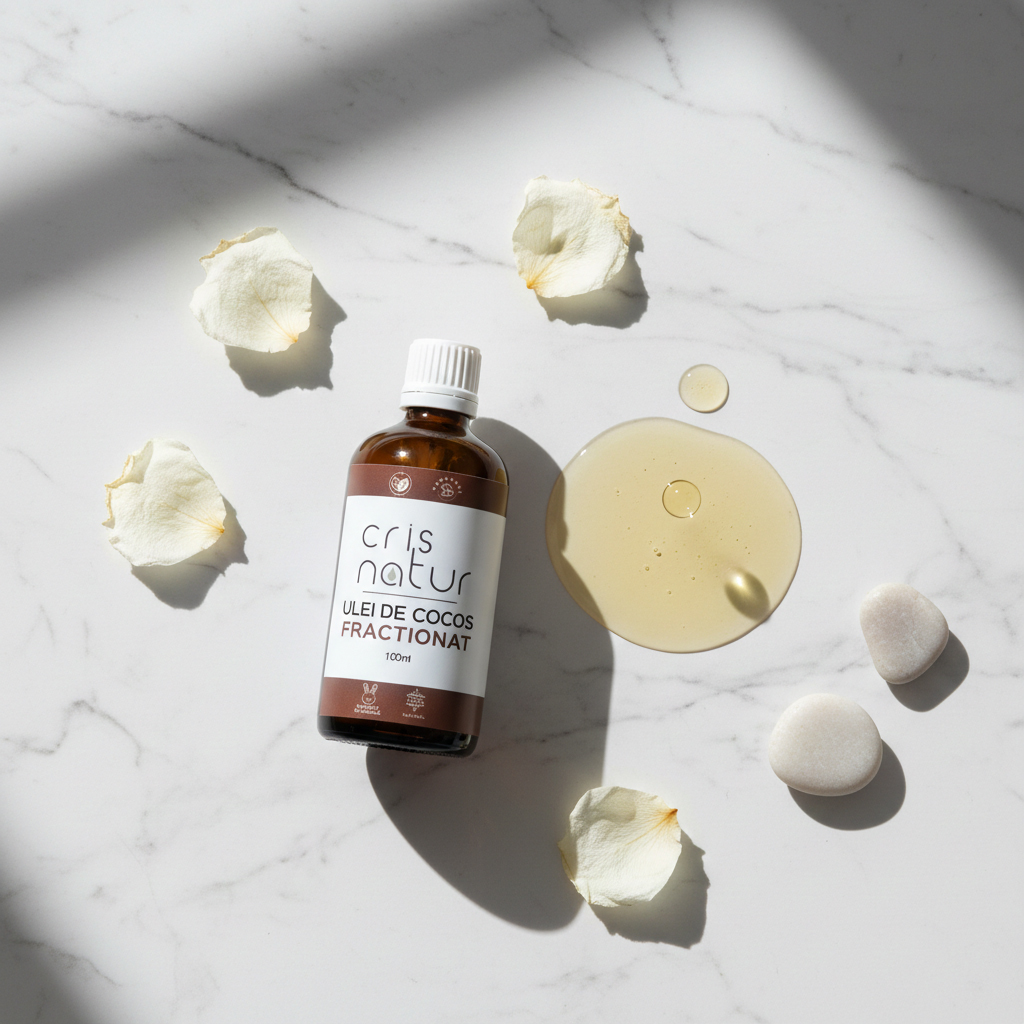 Uleiul de cocos fractionat este un ulei vegetal cosmetic în care moleculele mari sunt separate, rezultând un ulei lichid, stabil și cu absorbție rapidă – ideal pentru piele și păr.